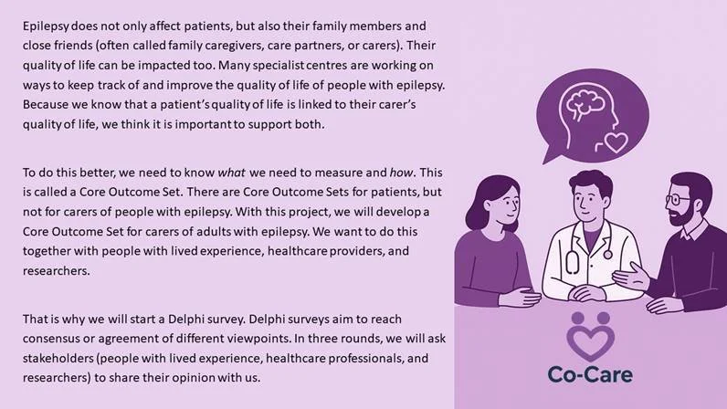 Epilepsy affects family members and carers/caregivers too. That’s why in this study, they are trying to identify how their lives are impacted to improve their quality of life. Many specialist centres are working on ways to keep track of and improve the quality of life of people with an epilepsy. Because it's known that a patient's quality of life is linked to their carer's - they think it's important to support both.